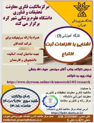 مرکز مالکیت فکری معاونت تحقیقات و فناوری دانشکده علوم پزشکی شهرکرد در نظر دارد کارگاه آموزشی با عنوان “کارگاه آموزشی اشنایی با الزامات ثبت اختراع” در روز شنبه مورخ ۲۶/۹/۱۴۰۱ و در ساعت ۱۳ تا ۱۵ بصورت مجازی برگزار نماید
