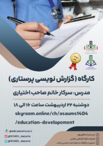 کارگاه اصول گزارش نویسی در پرستاریکارگاه ها12th می 2025📣 کمیته دانشجویی توسعه آموزش علوم پزشکی دانشکده علوم پزشکی اسدآباد برگزار میکند: 🔴 کارگاه “ اصول گزارش پرستاری نویسی ” …